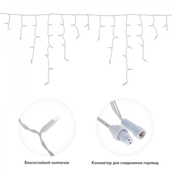 Данная гирлянда имеет Белый цвет свечения и предназначена для использования как внутри помещения, так и снаружи.