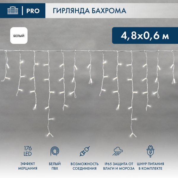 Данная гирлянда имеет Белый цвет свечения. Ее особенностью является наличие мерцающих светодиодов Белого цвета, которые привлекают внимание и значительно преображают украшенную поверхность (мерцает каждый пятый светодиод).
