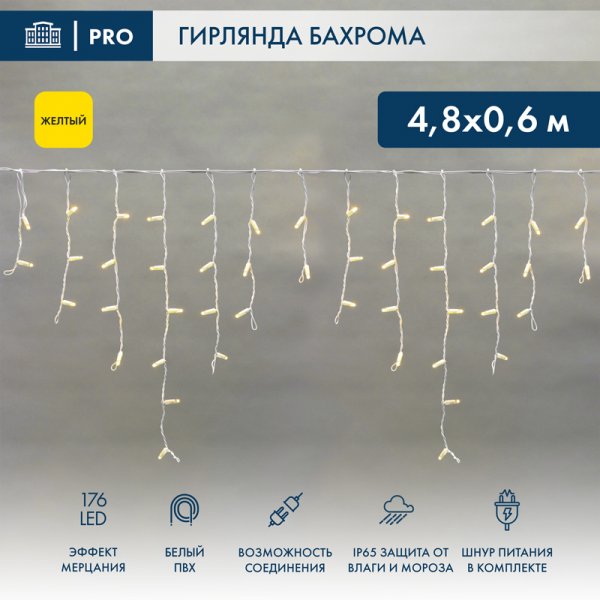 Данная гирлянда имеет Желтый цвет свечения. Ее особенностью является наличие мерцающих светодиодов Белого цвета, которые привлекают внимание и значительно преображают украшенную поверхность (мерцает каждый пятый светодиод).