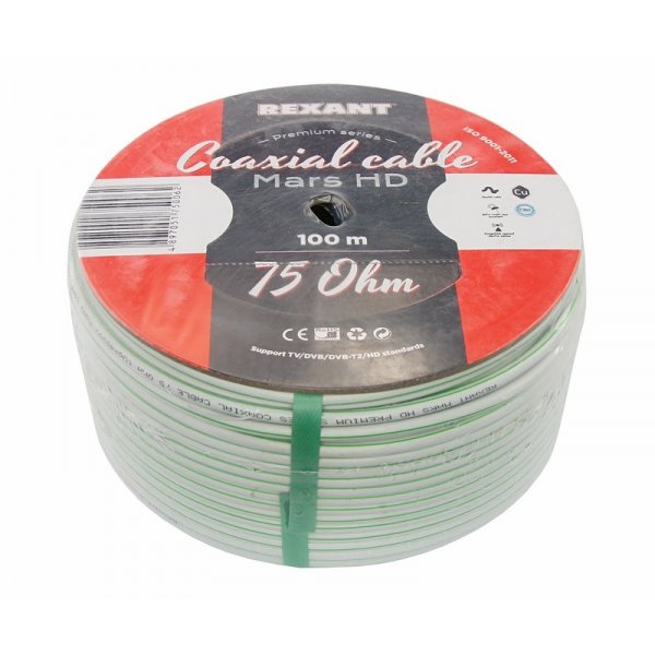 Кабель MARS HD 75 Ohm REXANT. Состоит из центрального медного провода и металлической оплетки (экрана), разделенных между собой слоем диэлектрика (внутренней изоляции) и имеет общую внешнюю оболочку ПВХ (PVC). Кабель служит для передачи высокочастотных сигналов и имеет волновое сопротивление 75 Ом. Коаксиальные кабели, предназначенные для работы в СВЧ диапазоне, называются еще радиочастотными кабелями.