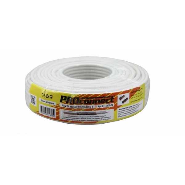 Кабель RG-6U (75 Ом), 48 % белый (бухта 50 м) PROconnect коаксиальный радиочастотный со вспененной полиэтиленовой изоляцией и в ПВХ оболочке. Является самым распространенным решением для подключения внутренних и межблочных соединений общепромышленных и бытовых радиотехнических устройств, для подключения систем телевидения, а также для подключения видеокамер наружного и внутреннего наблюдения.