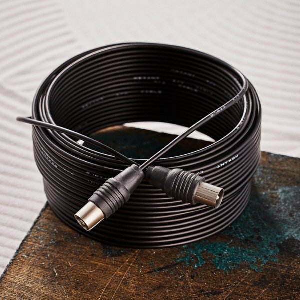 TV удлинитель 15 м TV штекер - TV штекер REXANT предназначен для передачи аналоговых аудио- и видеосигнала телевизионной сети к телевизору при подключении к телевизионной розетке, для подключения различного телекоммуникационного оборудования (ресиверы, ТВ-приставки и т. д.). Его также можно используют в качестве удлинителя высокочастотного кабеля для передачи ТВ сигнала от телевизионной антенны. C обеих сторон шнура располагаются штекеры TV разъема.