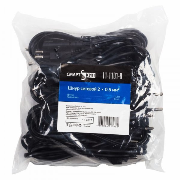 Шнур сетевой 1.5 м 2x0.5 мм² предназначен для подключения к сети переменного тока (AC) с напряжением 220 B аудио- и видеоаппаратуры, источников питания ноутбуков, игровых консолей и других приборов, имеющих штыревой сетевой разъем типа С8 (известен из-за его формы как «восьмерка»). Данный сетевой шнур (IEC cord) оснащен с одной стороны литой неразборной плоской вилкой (евро), с другой — литым гнездовым неполяризованным разъемом типа C7 (евроразъем) и двухжильным проводом с сечением жил 0.5 мм².