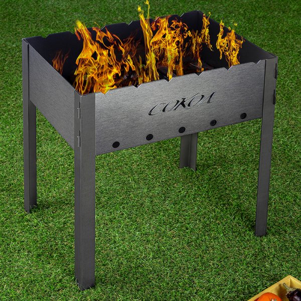Компактный разборный мангал, изготовленный из 1,5 мм стали. Многоразового использования. Для установки не требуются специальные инструменты. Позволяет разместить до 6 шампуров в специальных прорезях. Высота в 505 сантиметров удобна для приготовления шашлыков, а размеры жаровни 445 Х 295 Х 155 мм позволят разместить шампуры для небольшой компании. Мангал не подвержен тепловым деформациям ни от углей, ни от дров.