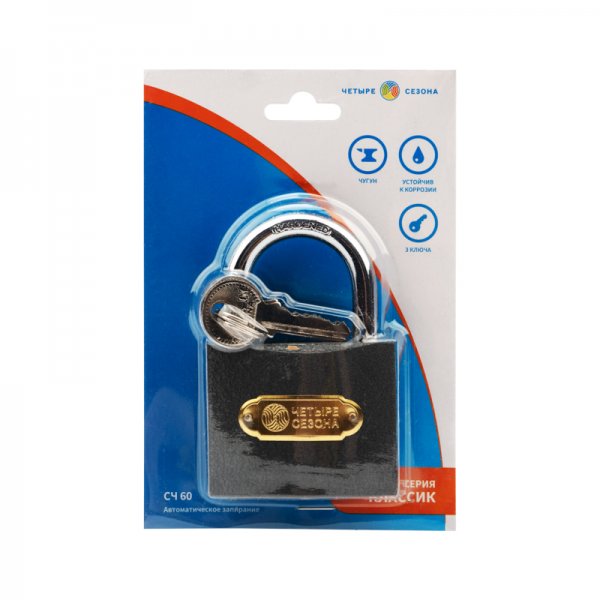 Навесной замок ЧЕТЫРЕ СЕЗОНА идеально подходит для защиты вашего имущества от непрошенных гостей. Замок пригодится для запирания гаражных ворот, распределительных щитков, складов и других объектов.