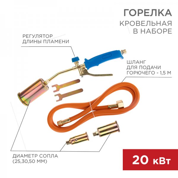 Горелка пропановая в наборе REXANT ГВП 450КР используется в кровельных работах. Данная горелка используется как правило для расплавления битума, который в дальнейшем идет на восстановление кровли. Также можно использовать для ремонта кабельных линий, работе с толстостенными термоусаживаемыми изделиями и трубками, нагрева изделий и заготовок из черных и цветных металлов, обжига краски, сушки различных литейных форм. В комплект входит специальная горелка, шланг, три насадки разного диаметром от 25 до 50 мм и 2 ключа. Благодаря этому горелка является универсальным инструментом для проведения широкого спектра работ.