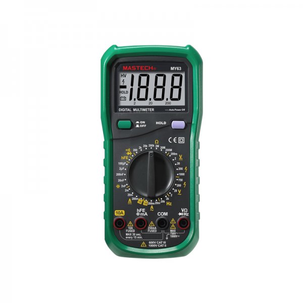 Мульти́метр — электроизмерительный прибор, который включает в себя несколько функций и набор измеряемых параметров. Прибор MY63N относится к обновленной серии N, что отразилось на внешнем и внутреннем дизайне, ряде параметров и улучшенной схемотехнике, добавлена функция памяти данных на экране.. Все приборы серии MY измеряют постоянное и переменное напряжение, постоянный и переменный ток, сопротивление в цепи, емкость, частоту, проверить транзисторы. А также, с помощью прибора MY63N можно проводить тестирование диодов, прозвонку целостности цепи и измерение коэффициента усиления транзисторов.