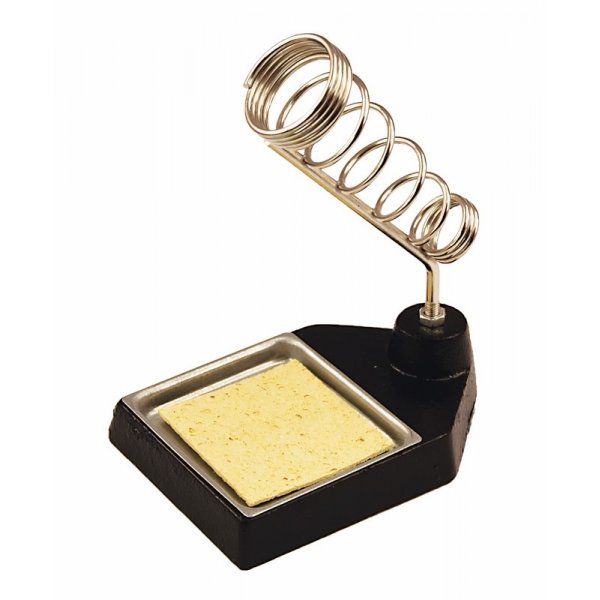 Выполнена из витой хромированной конусообразной пружины и чугунной платформы с ложементом под губку для очистки жала паяльника от остатков припоя. Губка для очистки жала паяльника в комплекте.