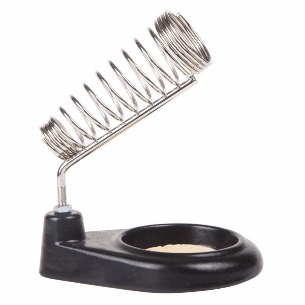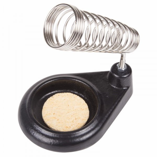 Выполнена из витой хромированной конусообразной пружины и чугунной платформы с ложементом под губку для очистки жала паяльника от остатков припоя. Губка для очистки жала паяльника в комплекте.