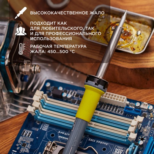 Паяльник выполнен с керамическим нагревательным элементом, поэтому нагревается быстрее, чем нихромовый и при бережном отношении прослужит много лет. Долговечное жало паяльника состоит из медного сердечника покрытого слоем электролитически осажденного железа. Рабочая часть жала электрохимически покрыта слоем олова (что обеспечивает облуживаемость), а остальная поверхность — хромирована.