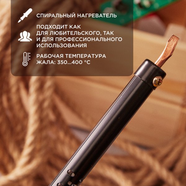 Электрический паяльник со спиральным нагревателем (ЭПСН) питается напрямую от сети 220 В, рабочая температура рабочего стержня 340...400 °С, время разогрева до рабочей температуры — 7 мин., класс защиты — II