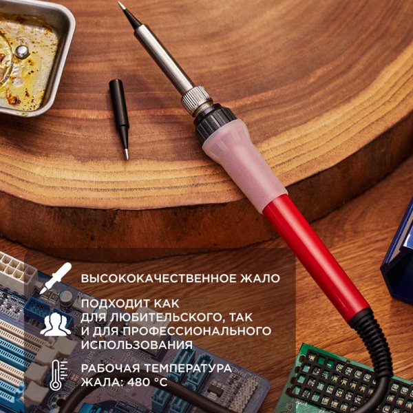 Паяльник выполнен с керамическим нагревательным элементом и долговечным жалом. Острое тонкое жало идеально подойдет для точных работ с электронными компонентами.