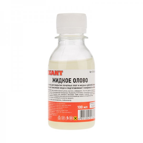 Жидкое олово (химическое лужение плат) 100 мл REXANT предназначено для покрытия печатных плат и медных деталей оловом. В результате химического лужения поверхностей и деталей предотвращается окисление меди и поверхность готова к пайке.