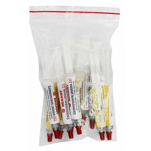 Смазка силиконовая 221 (до +350 °C) 2 мл (шприц) REXANT предназначена для смазывания механизмов и трущихся деталей, конструкционных резьбовых соединений.