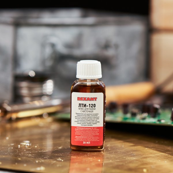 Флюс для пайки ЛТИ-120 30 мл (масленка) REXANT предназначен для удаления оксидов с поверхности под пайку, улучшения растекания жидкого припоя и защиты от действия окружающей среды при пайке нержавеющих сплавов, меди и её сплавов, оцинкованных изделий, нихрома, свинца, никеля, серебра, кадмия, палладия, висмута. Данный низкотемпературный флюс применяется при пайке деталей или поверхностей припоями оловянно-свинцовой группы в температурном диапазоне 200-300℃. После пайки смывка не требуется, более того, остатки флюса служат защитным покрытием мест пайки. При необходимости его возможно растворить спиртом или ацетоном.