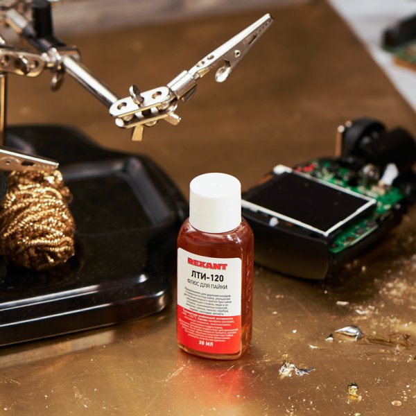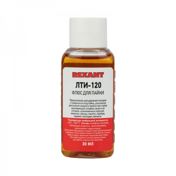 Флюс для пайки ЛТИ-120 30 мл REXANT предназначен для удаления оксидов с поверхности под пайку, улучшения растекания жидкого припоя и защиты от действия окружающей среды при пайке нержавеющих сплавов, меди и её сплавов, оцинкованных изделий, нихрома, свинца, никеля, серебра, кадмия, палладия, висмута.