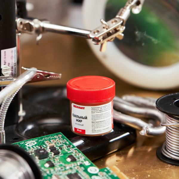 Паяльный жир активный 20 мл REXANT предназначен для удаления оксидов с поверхности под пайку, улучшения растекания жидкого припоя при пайке радио и электротехнических устройств. Главным образом, жир хорошо держится на различных металлических контактах, тем самым в отличие от жидкого флюса, есть возможность точного дозирования, и высокой скорости нанесения на большое количество мест паек.