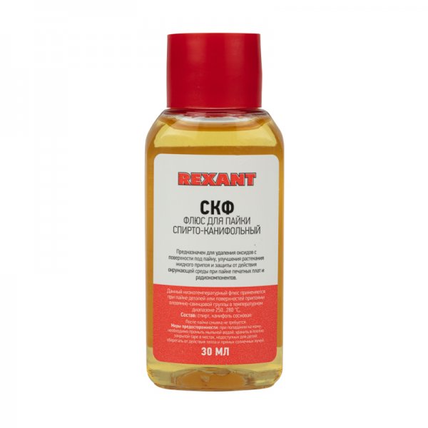 Флюс для пайки СКФ спирто-канифольный 30 мл REXANT предназначен для удаления оксидов с поверхности под пайку, улучшения растекания жидкого припоя и защиты от действия окружающей среды при пайке печатных плат и радиокомпонентов. Данный низкотемпературный флюс применяется при пайке деталей или поверхностей припоями оловянно-свинцовой группы в температурном диапазоне 250...280 °С. После пайки смывка не требуется.