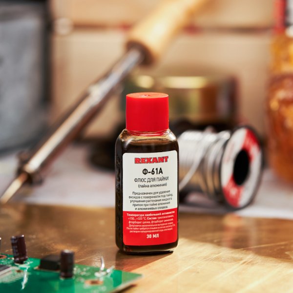Флюс для пайки Ф-61А (пайка алюминия) 30 мл REXANT предназначен для удаления оксидов с поверхности под пайку, улучшения растекания жидкого припоя при пайке алюминия и алюминиевых сплавов. Изготовлен на основе фторборатов, что значительно выделяет его из всей группы соединений для пайки.