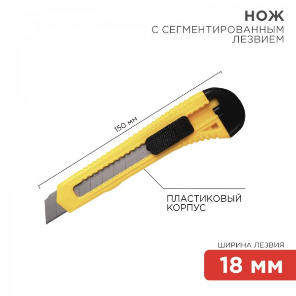 Нож REXANT с выдвижным сегментированным отламывающимся лезвием — отличный помощник для разрезания различных материалов: пластика, картона, бумаги.