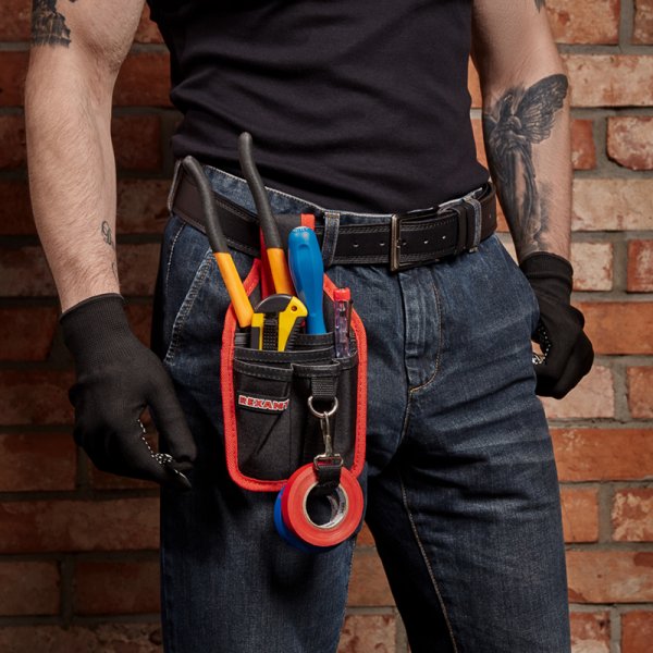 Сумка монтажника съемная поясная для хранения инструмента. Сумка изготовлена из синтетического материала, легко крепится на любой ремень с помощью манжеты с надежной металлической кнопкой.