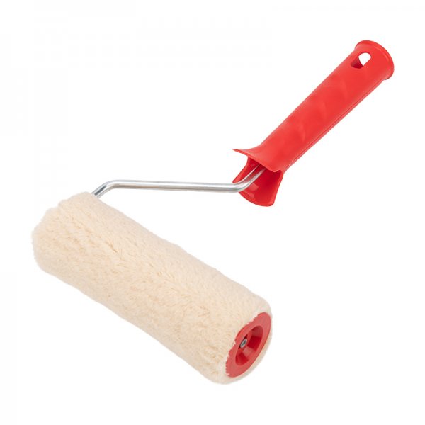 Валик состоит из пластмассового цилиндра, мягкой шубки, бугеля (изогнутого металлического стержня) и удобной пластиковой рукоятки.