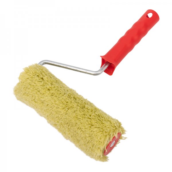 Валик состоит из пластмассового цилиндра, мягкой шубки, бугеля (изогнутого металлического стержня) и удобной пластиковой рукоятки.