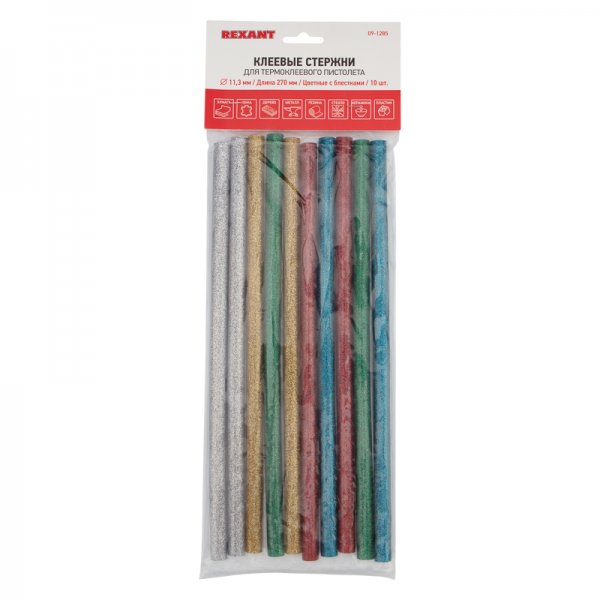 Клеевые стержни REXANT, Ø11 мм, 270 мм, цветные с блестками, 10 шт., хедер (это 09-1215, переход на упак.)