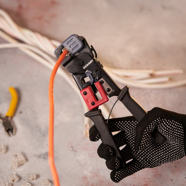 Кримпер REXANT HT-376E - универсальный инструмент для обжима разъемов RJ-45 (8P8C), RJ-12 (6P6C) и RJ-11 (6P4C и 6P2C), а также для снятия изоляции и обрезки проводов.