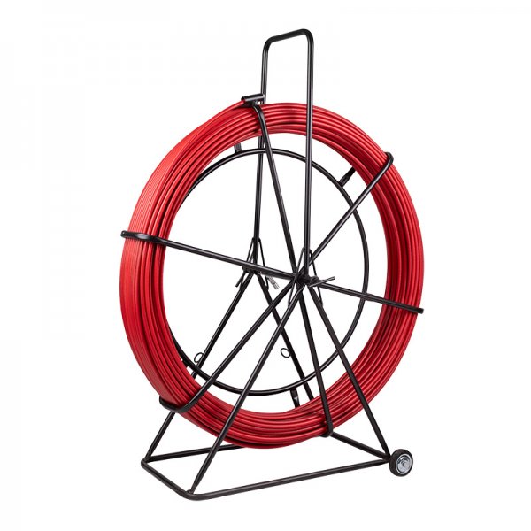 Барабан с стеклопрутком установлен на металлической тележке с колесиками.
