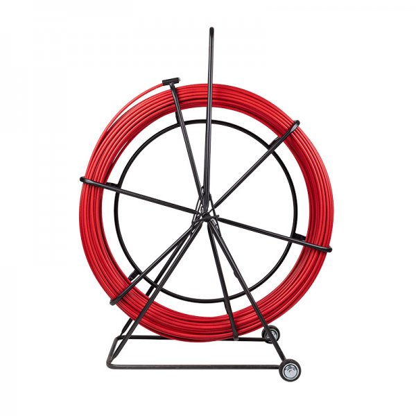 Барабан с стеклопрутком установлен на металлической тележке с колесиками.