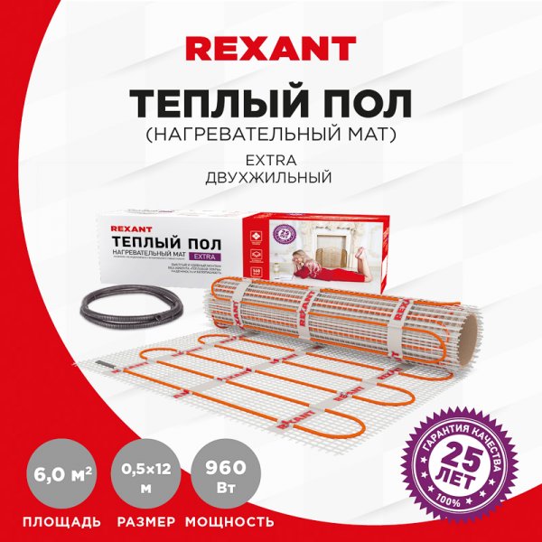 Нагревательные маты REXANT Extra с поверхностной мощностью тепловыделения 160 Вт/м2 изготовлены из тонкого двухжильного нагревательного кабеля и применяются в системах «Теплый пол» для комфортного подогрева помещений с покрытием пола из керамической плитки или другого аналогичного материала.