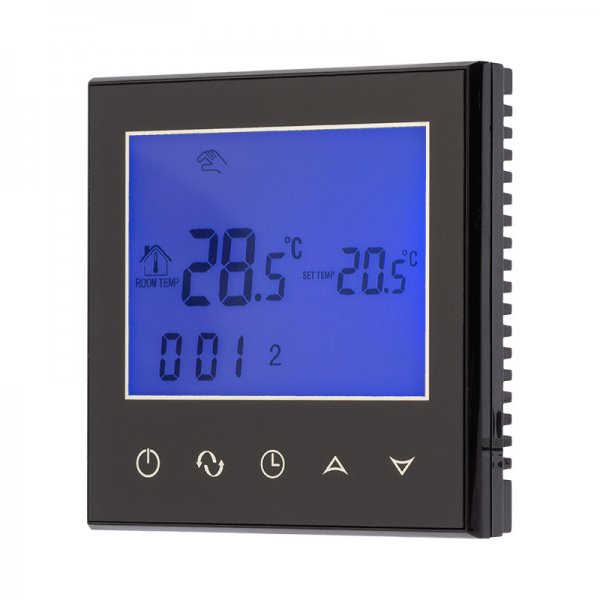 Терморегулятор оснащен ЖК дисплеем. Есть возможность задавать до 6 временных периодов на каждый день недели, а также выбрать ручной режим управления. С помощью специальных функций двойного контроля и двойной температуры прибор получает данные не только о температуре в помещении, но и о температуре оборудования. Когда температура в системе выше, чем установленная, терморегулятор автоматически остановит нагрев. Такой режим обеспечивает разумное потребление ресурсов и продлевает срок службы системы отопления.