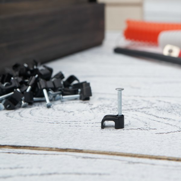 Высококачественный плоский крепеж кабеля REXANT представляет собой П-образную пластиковую скобу, выполненную из качественного пластика и идущую в комплектации с гвоздём из закаленного металла, при помощи которого данная скоба крепит к стенам, потолкам и несущим конструкциям кабели, провода.