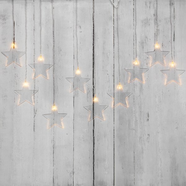 Гирлянда «Звезды» длиной 1,5 метра выполнена в виде бахромы. 10 диодов излучают белый свет теплого оттенка. Светодиоды не нагреваются, не вырабатывают вредный для зрения спектр и экономно потребляют электроэнергию. Вертикальные нити длиной 40 и 60 см удерживают 10 волшебных звезд размером 11,5 см. Гирлянда с ассиметричными нитями с защитой IP20 предназначена для использования в сухих отапливаемых помещениях и станет прекрасным украшением окна, арки, открытого дверного проема, свободного пространства между комнатами. Для подключения к розетке предусмотрен 3-метровый питающий шнур.