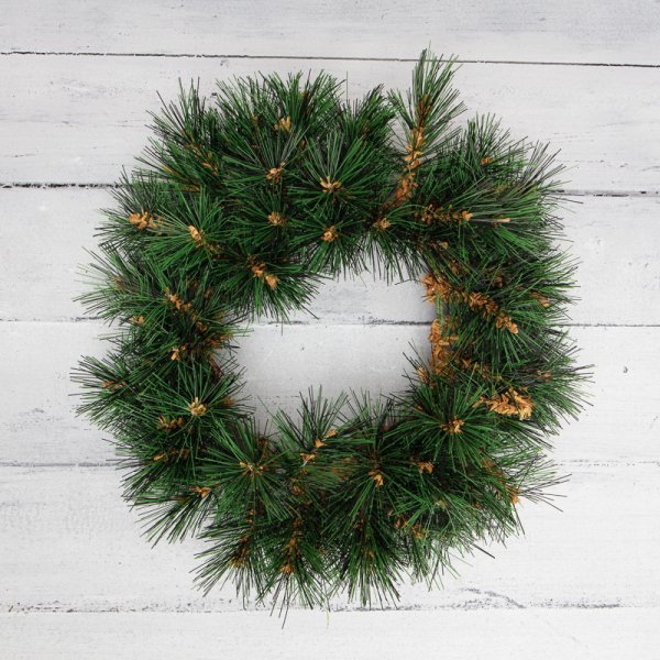 Еловый венок диаметром 30 см — реалистичный новогодний декор, выполненный в виде молодых сосновых веточек из лески, сплетенных в аккуратное кольцо. Декоративное изделие станет прекрасным украшением двери, стены, окна и может использоваться как дома, так и на улице. Если добавить к венку светодиодную гирлянду на батарейках, небольшие елочные игрушки, мишуру, то композиция приобретет нарядный и завершенный вид. Украшение предполагает простое хранение и рассчитано на долгий срок службы.