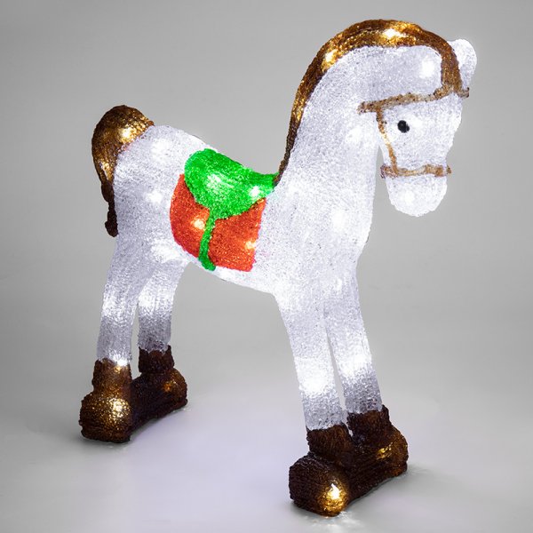 Акриловая фигура «Лошадка» высотой 38 см светится 60 яркими диодами, которые излучают белый свет, мягко обрамляя контуры и создавая объемный эффект. Реалистичное цветовое оформление, фактурная поверхность, яркая подсветка — все это делает фигурку великолепным декором, который понравится и взрослым, и детям. Защита IP65 позволяет использовать изделие как дома, так и на улице при сложных погодных условиях. Понижающий трансформатор, идущий в комплекте, обеспечивает безопасную и стабильную работу от стандартной электросети 230 Вольт.