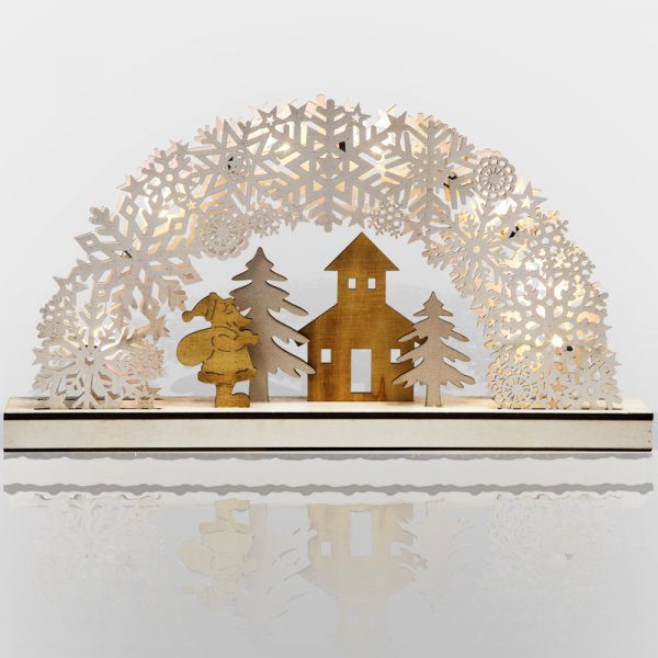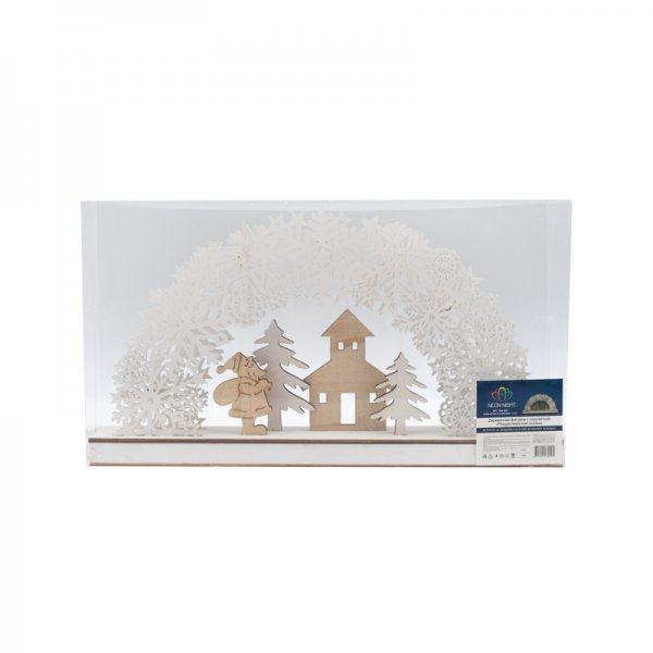 Деревянная фигурка с подсветкой «Рождественская сказка» 44,5×6×24 см представляет собой затейливую композицию из фигурок елей, Деда Мороза с мешком подарков и большой радуги из резных снежинок. 7 ярких диодов эффектно подсвечивают декор и питаются от 2 батареек типа ААА. Светодиоды экономичны, долговечны и абсолютно безопасны. Удобная подставка подходит для размещения на любой ровной поверхности. Фигурка «Рождественская сказка» — идеальный подарок к Новому году, который порадует и детей, и взрослых.