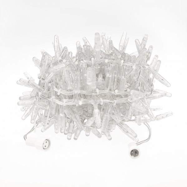 Данная гирлянда имеет длину 10 м, на которой равномерно расположено 200 диодов теплого белого цвета свечения.