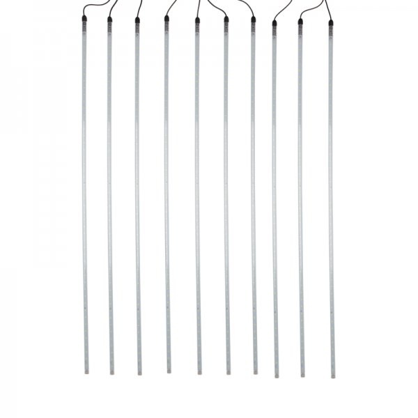 Светодиодная гирлянда «Тающие сосульки» – это оригинальное, красивое и современное средство оформления фасадов и интерьеров зданий, деревьев, витрин и т. д. Она представляет собой комплект из 10 прозрачных пластиковых трубок, расположенных на расстоянии 100 см друг от друга. По всей длине каждой трубки внутри надежно закреплена плата со светодиодами и микрочипом, обеспечивающим динамику с эффектом стекающей капли. Длина каждой трубки 100 см. Гирлянда работает от напряжения 24 V, трансформатор идет в комплекте.