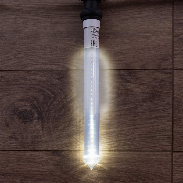 Светодиодная сосулька представляет собой прозрачную трубку длиной 30 см. Внутри надежно закреплена двусторонняя тонкая плата со светодиодами белого цвета свечения и микрочипом, обеспечивающим световой динамический эффект стекающей капли. Сосулька оснащена стандартным цоколем e27, что позволяет ее легко использовать на улице, вкрутив в патрон гирлянды Белт-лайт.