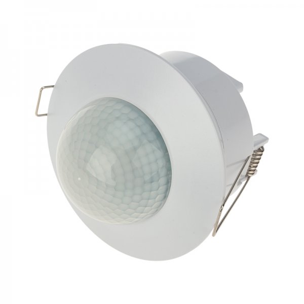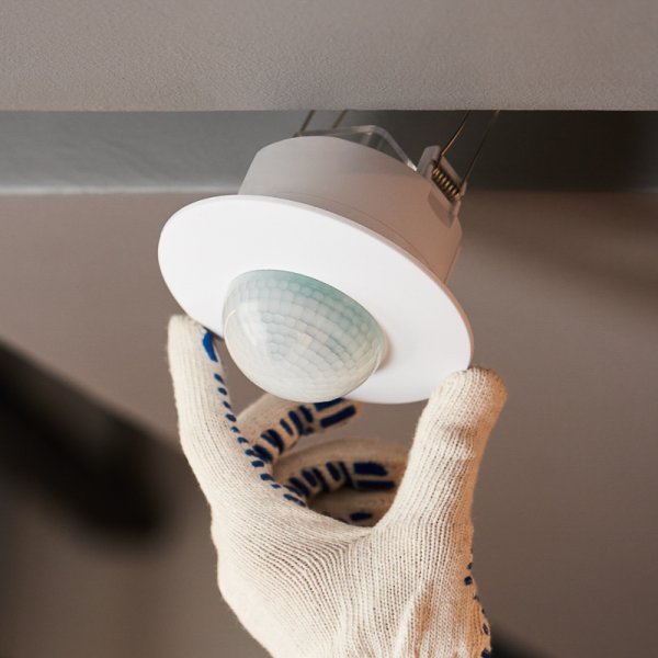 Датчик движения точечный встраивается в подвесной потолок с диаметром установочного отверстия 75 мм. Визуально датчик гармонично встраивается в обстановку и не выделяется на потолке.