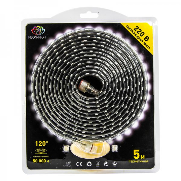 LED Лента 220В, 6x10.6мм, IP67, SMD 3014, 120 LED/м, теплый белый (3000 К), блистер 5м (с комплектом подключения)