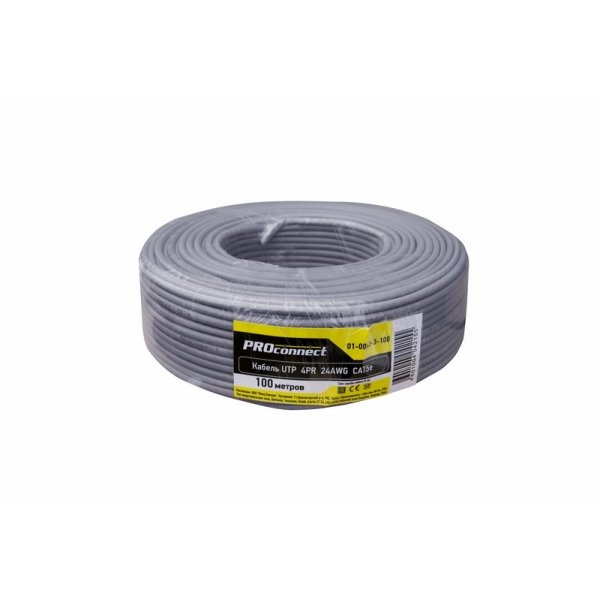 Кабель UTP 4PR 24AWG, CCA, CAT5e (бухта 100 м) PROconnect. Неэкранированная витая пара, материал проводника алюминий плакированный медью CCA, калибр (24 AWG). Материал оболочки — ПВХ (PVC).