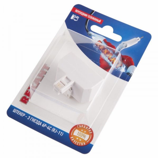 Телефонный тройник 6Р-4С (RJ-11) незаменим для прокладки телефонных кабелей и настройки телекоммуникационной сети, если требуется получить три выхода для кабелей. На одном конце тройника расположен штекер 6Р-4С (RJ-11), подключающийся в телефонное гнездо 6P-4C (RJ-11), на другом конце - три гнезда 6Р-4С (RJ-11), предназначенные для трех телефонных кабелей.