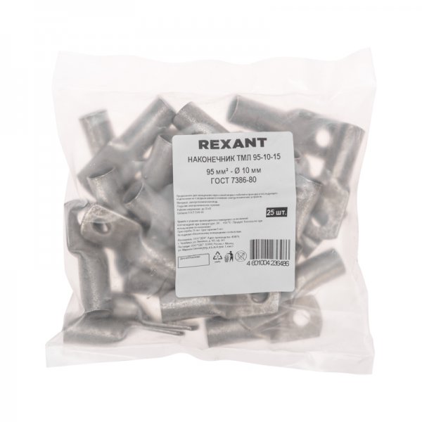 Наконечник ТМЛ 95–10–15 (95мм² - Ø10мм) REXANT предназначен для оконцевания проводов и кабелей с медными и алюминиевыми жилами посредством опрессовки для последующего болтового соединения проводника с оборудованием или шиной.