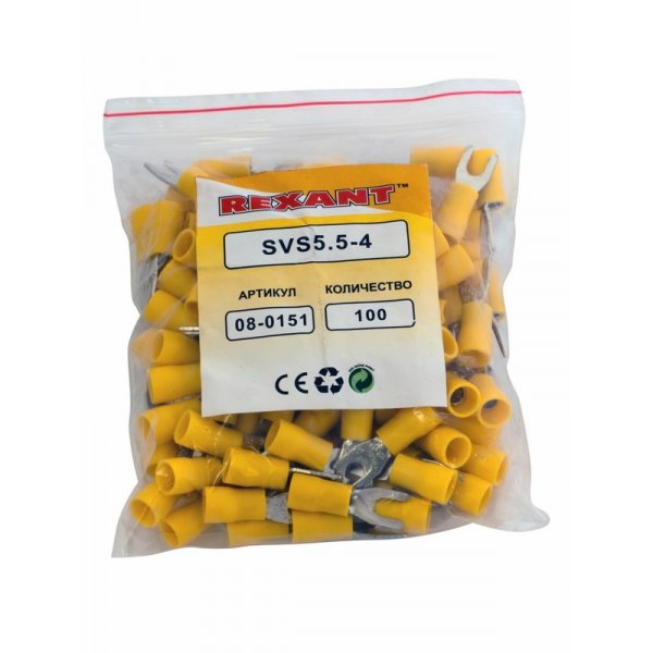 Изолированный вилочный наконечник REXANT состоит из двух компонентов: металлического коннектора (вилка) и защитного изолятора, закрывающего место обжима. Металлический коннектор изготовлен из латуни, с поверхностным электролитическим лужением (возможно использование в условиях повышенной влажности), а изолятор клеммы из поливинилхлорида (ПВХ), который надежно защищает место обжима кабеля.