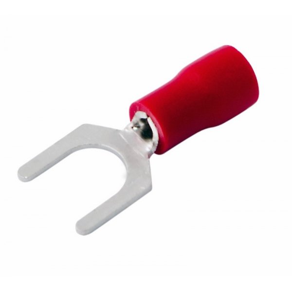 Наконечник вилочный изолированный (НВИ - 5.3 мм) 0.5-1.5 мм² REXANT предназначен для создания качественного подключения электрооборудования, которое при необходимости возможно разъединять без полного откручивания крепежного соединения, всего лишь ослабив винтовую фиксацию. Такая клемма используется для оконцовывания многожильных медных проводов при монтаже мобильных электрических контактных соединений на подвижном составе (автомобиле-, вагоно-, самолето- и судостроении) или в других местах, где важна надежность соединения (к примеру, телефонное или климатическое оборудование).