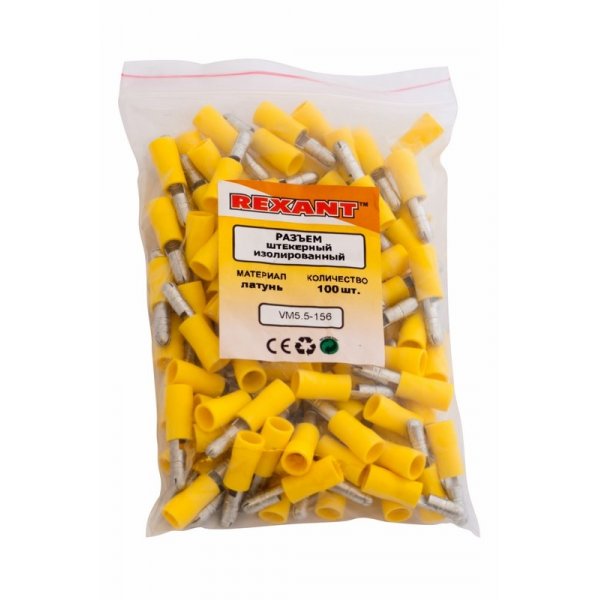 Изолированная штекерная клемма REXANT состоит из двух компонентов: металлического коннектора (штекер) и защитного изолятора, закрывающего место обжима провода. Металлический коннектор изготовлен из латуни, с поверхностным электролитическим лужением, а изолятор клеммы из поливинилхлорида (ПВХ), надежно защищающий место обжима кабеля от физических воздействий, а человека от поражения электрическим током. Обжатие производится специальными пресс-клещами (ht-301 H, ht-301 N, ht-301 W) поверх защитного изолятора. Цвет изолятора желтый.