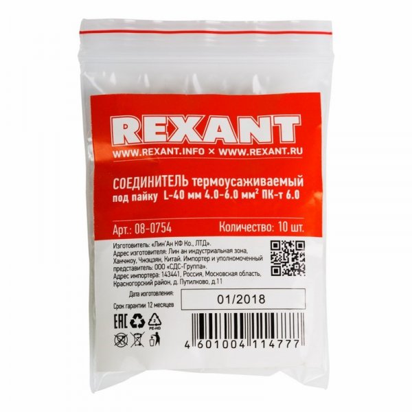 Соединитель термоусаживаемый под пайку (L-40 мм) 4.0-6.0 мм² желтый REXANT предназначен для соединения медных многопроволочных проводов внахлест или встык методом термообработки.
